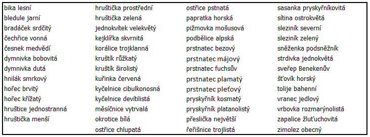 S bylinami je to jako s puzzle, je jich opravdu velmi mnoho a tak sběr údajů je zdlouhavý. Proto v tabulce uvedu jen některé, málo hojné, vzácné a ohrožené, i když například česnek medvědí a některé jiné jsou v posledních letech 2020 - 2022 v Rychlebských horách velmi rozšířeny. Také ostřici chlupatou jsem našel na více vodních plochách, než je uvedeno ve zmíněné literatuře na první straně flóry.